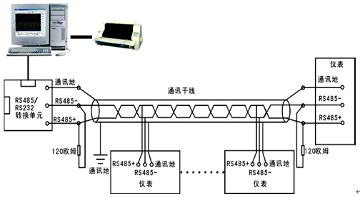 (1)本系列數據記錄儀的RS-485 通訊線采用屏蔽雙絞線,其一端通過RS-232/485 轉換模塊接到計算機的串行通信口,另一端接到記錄儀通訊端子。