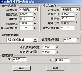0.95倍與1.05倍的整定倍數(shù)是針對(duì)第二次故障時(shí)“非全相零序定值”的。所以微機(jī)繼電保護(hù)測(cè)試儀窗口中的“不靈敏零序定值”必須依照保護(hù)實(shí)際的整定值設(shè)置。第二次故障的“最大故障時(shí)間”應(yīng)大于非全相零序保護(hù)的“整定動(dòng)作時(shí)間”。
