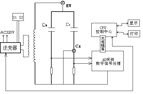 在交流電壓作用下,電介質(zhì)要消耗部分電能,這部分電能將轉(zhuǎn)變?yōu)闊崮墚a(chǎn)生損耗。這種能量損耗叫做電介質(zhì)的損耗。當(dāng)電介質(zhì)上施加交流電壓時(shí),電介質(zhì)中的電壓和電流間成在相角差ψ,ψ的余角δ稱(chēng)為介質(zhì)損耗角,δ的正切tgδ稱(chēng)為介質(zhì)損耗角正切。tgδ值是用來(lái)衡量電介質(zhì)損耗的參數(shù)。儀器測(cè)量線路包括一標(biāo)準(zhǔn)回路(Cn)和一被試回路(Cx),如圖1所示。標(biāo)準(zhǔn)回路由內(nèi)置高穩(wěn)定度標(biāo)準(zhǔn)電容器與測(cè)量線路組成,被試回路由被試品和測(cè)量線路組成。測(cè)量線路由取樣電阻與前置放大器和A/D轉(zhuǎn)換器組成。通過(guò)測(cè)量電路分別測(cè)得標(biāo)準(zhǔn)回路電流與被試回路電流幅值及其相位差,再由數(shù)字信號(hào)處理器運(yùn)用數(shù)字化實(shí)時(shí)采集方法,通過(guò)矢量運(yùn)算得出試品的電容值和介質(zhì)損耗正切值。
